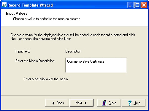 Notice how the first value of the MulCreator_tab table is extracted as the default value for the media creator. The picture below shows the Input Values screen for media description: